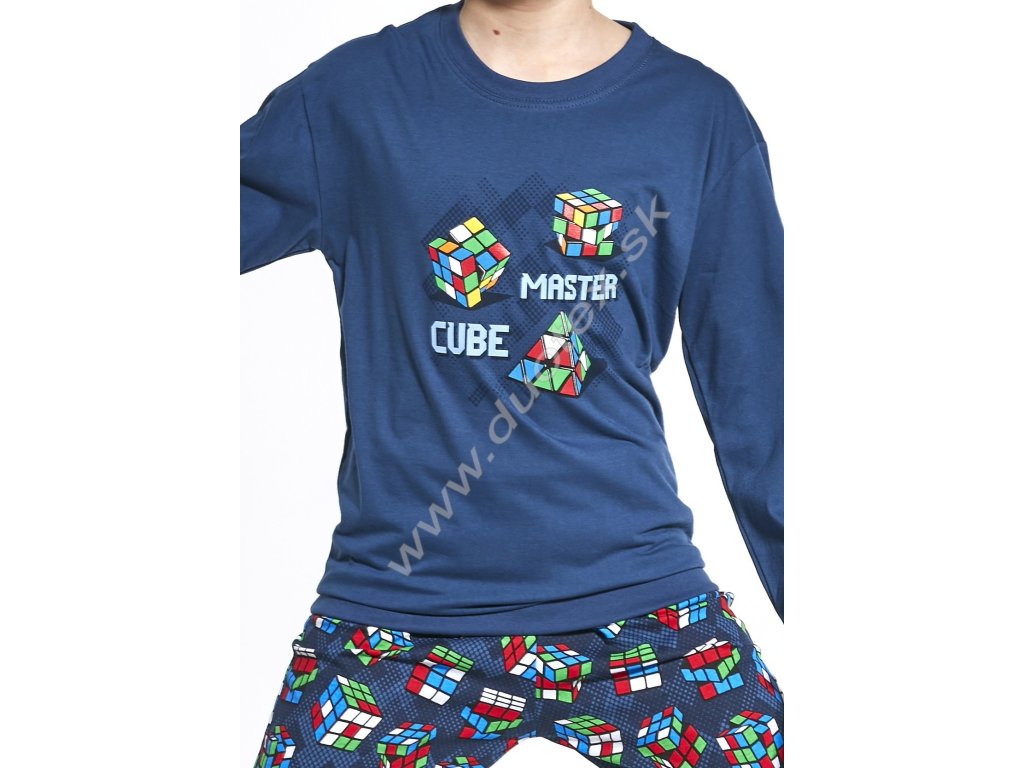 chlapecké pyžamo s dlouhým rukávem a dlouhými kalhotami, spodní část rukávů i kalhot stažena do pružného lemu, všívaná široká guma v pase kalhot. Pyžamo je vyrobeno ze 100% bavlněného úpletu.
