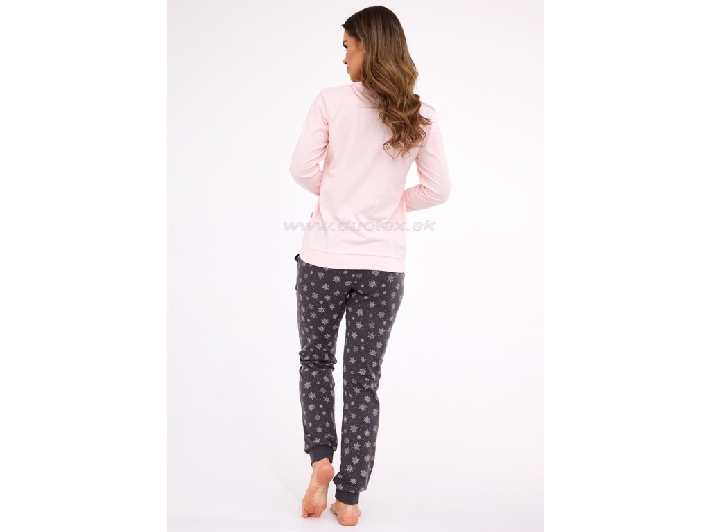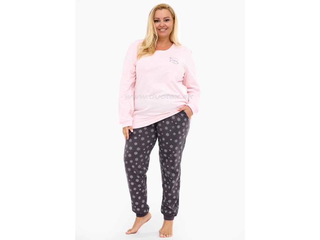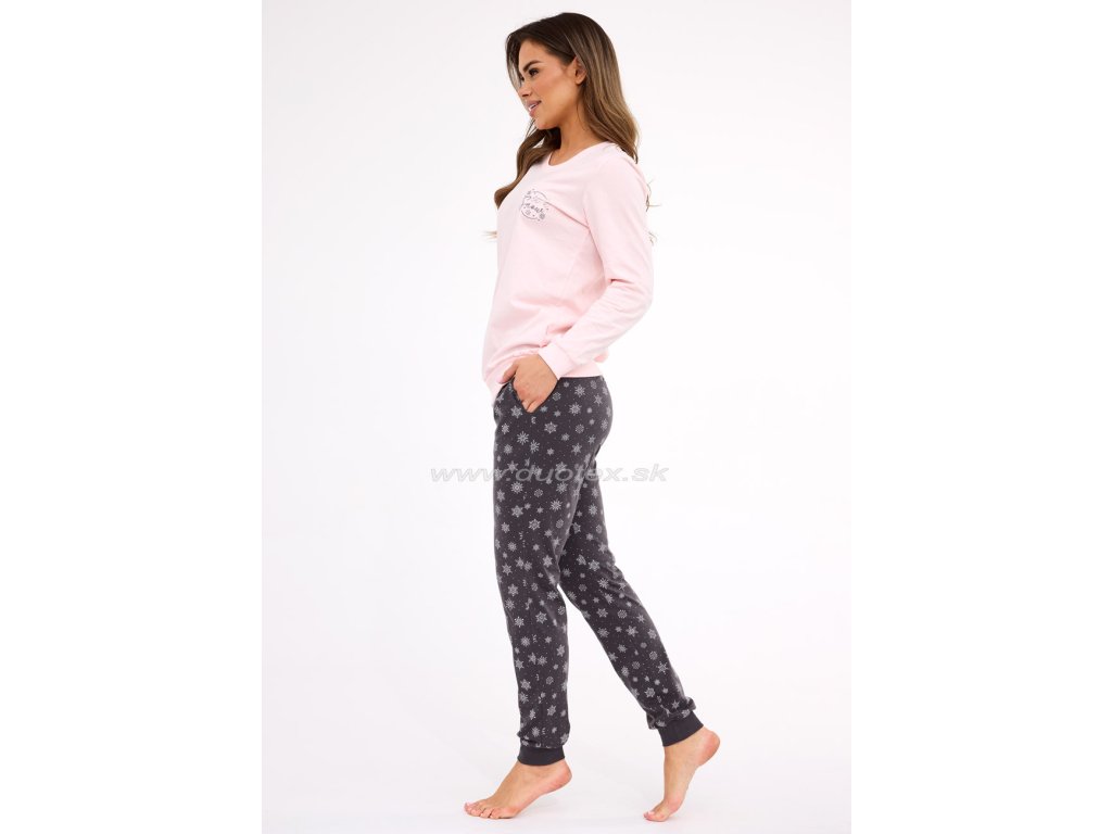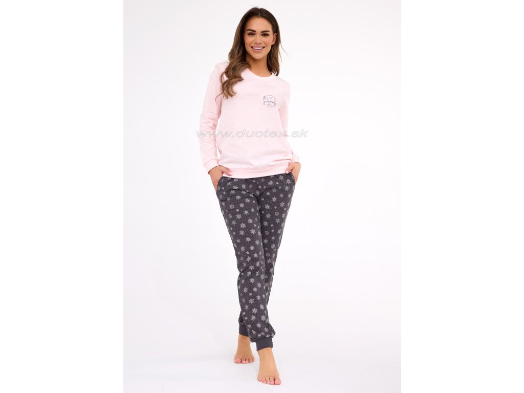 Dámské pyžamo s dlouhým rukávem a dlouhými kalhotami ukončenými pružným lemem vyrobeno ze 100% jemného bavlněného úpletu - všívaná guma v pase kalhot.
