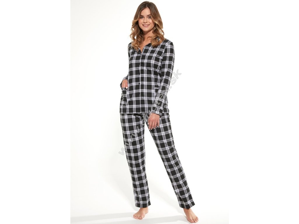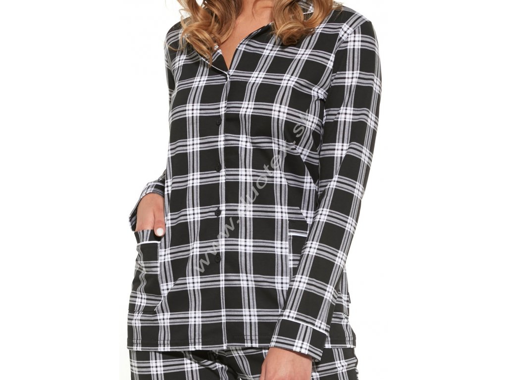 dámské černo-bílé kárované pyžamo s dlouhým rukávem, dlouhými kalhotami a zapínáním na knoflíky. Je vyrobeno ze 100% jemného bavlněného úpletu - všívaná široká guma v pase kalhot.