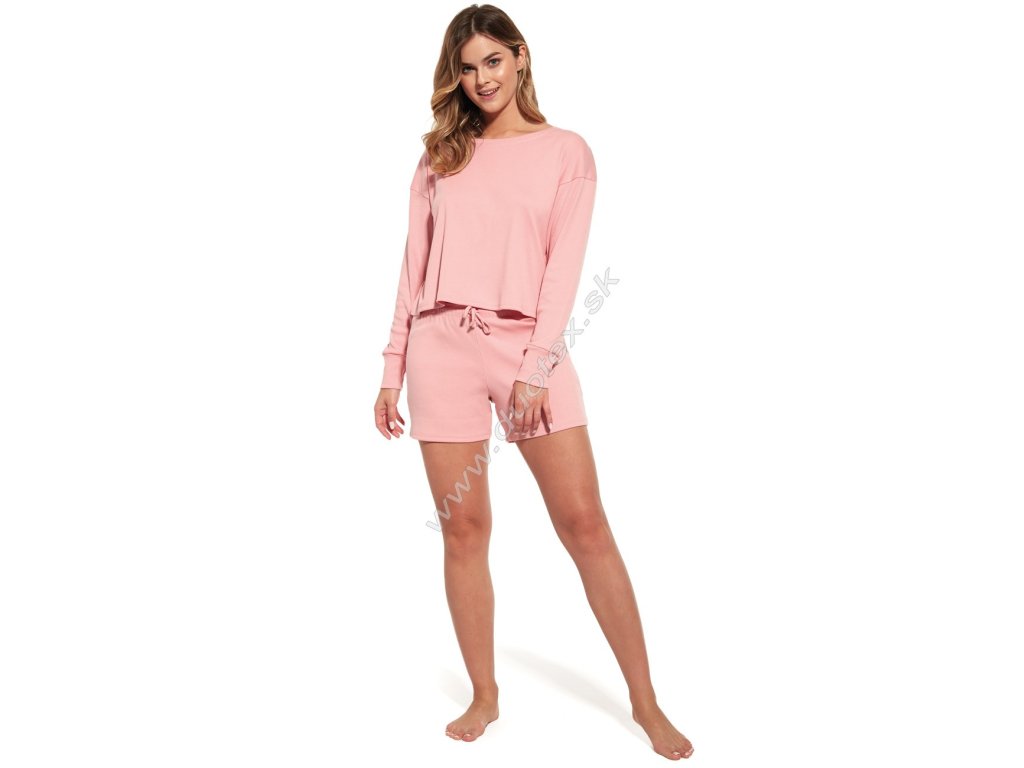 Dámské pyžamo s dlouhým rukávem a krátkými kalhotami vyrobené z kvalitního úpletu ze 100% bavlny, široká všívaná guma v pase kalhot se šňůrkou v tunelu.