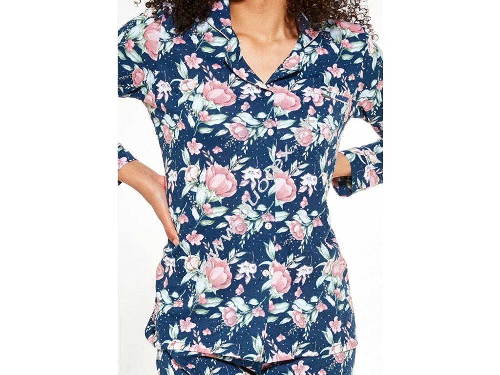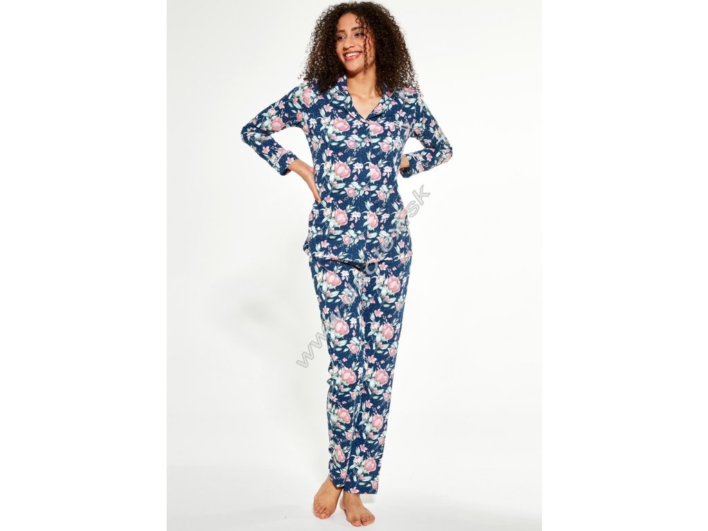 dámské pyžamo na zapínání s dlouhým rukávem a dlouhými kalhotami vyrobeno ze 100% jemného bavlněného úpletu - všívaná široká guma v pase kalhot.