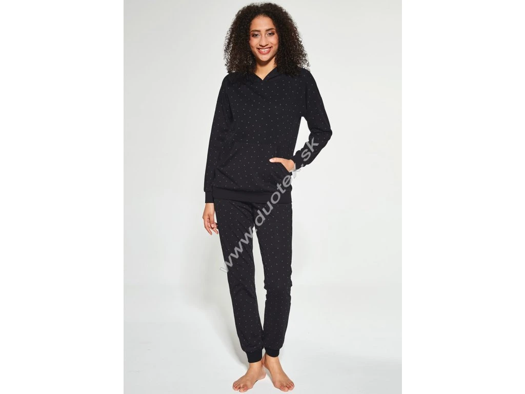 dámské pyžamo s dlouhým rukávem a dlouhými kalhotami vyrobeno ze 100% jemného bavlněného úpletu - všívaná široká guma v pase kalhot. Spodní část kalhot a rukávů je ukončena pružným lemem. Vrchní díl má kapuci a našívané boční kapsy. Pyžamo lze použít i jako domácí úbor.