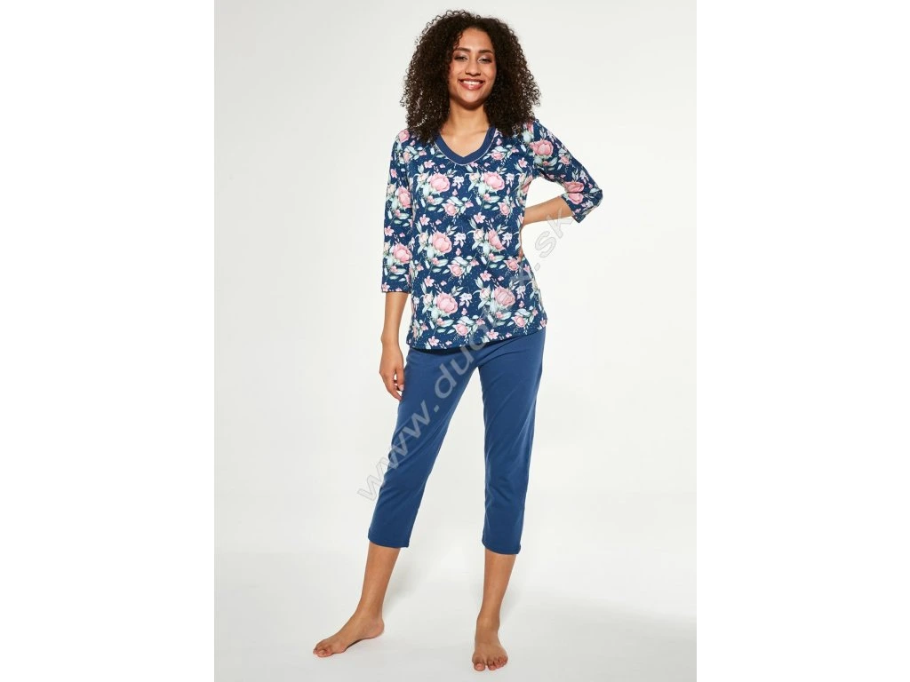 dámské pyžamo s výstřihem do tvaru V se 7/8 rukávem a 7/8 kalhotami, všívaná široká guma v pase kalhot. Pyžamo je vyrobeno ze 100% bavlněného úpletu.