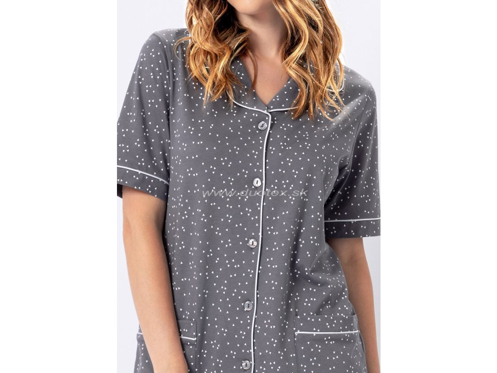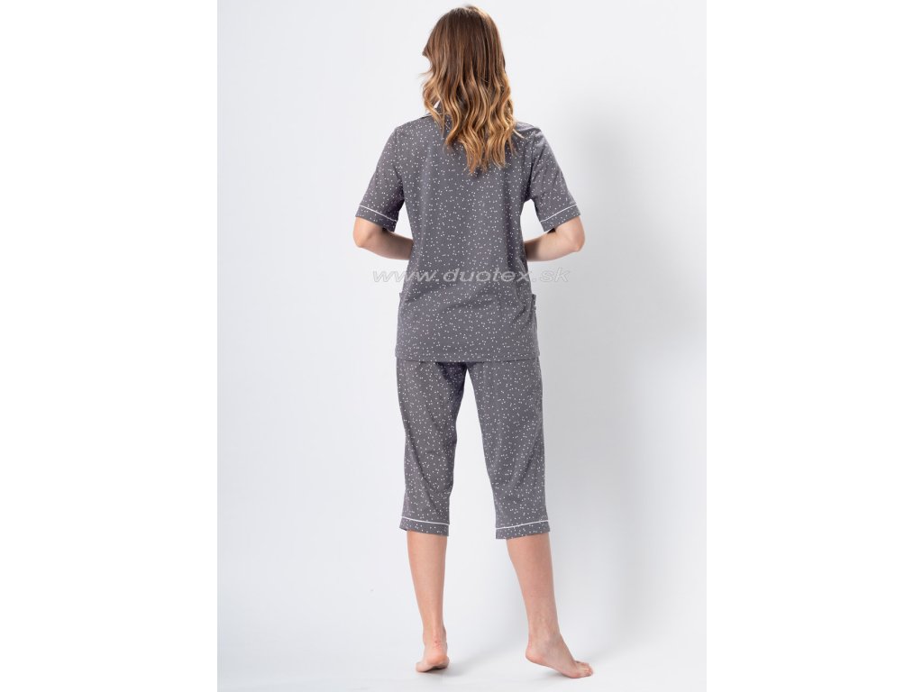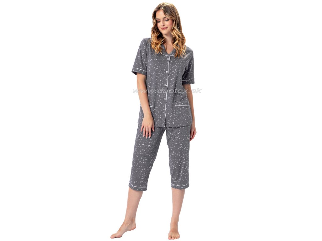 dámské pyžamo s krátkým rukávem a 3/4 kalhotami, přední díl na rozepínání. Je vyrobeno ze 100% bavlny - všívaná guma v pase kalhot