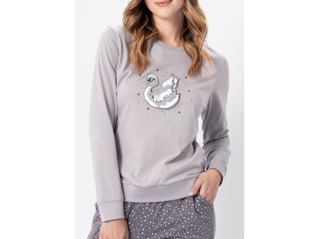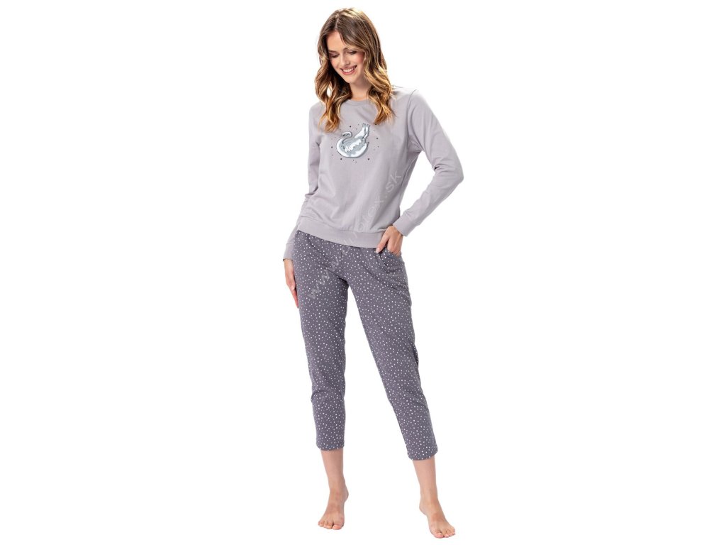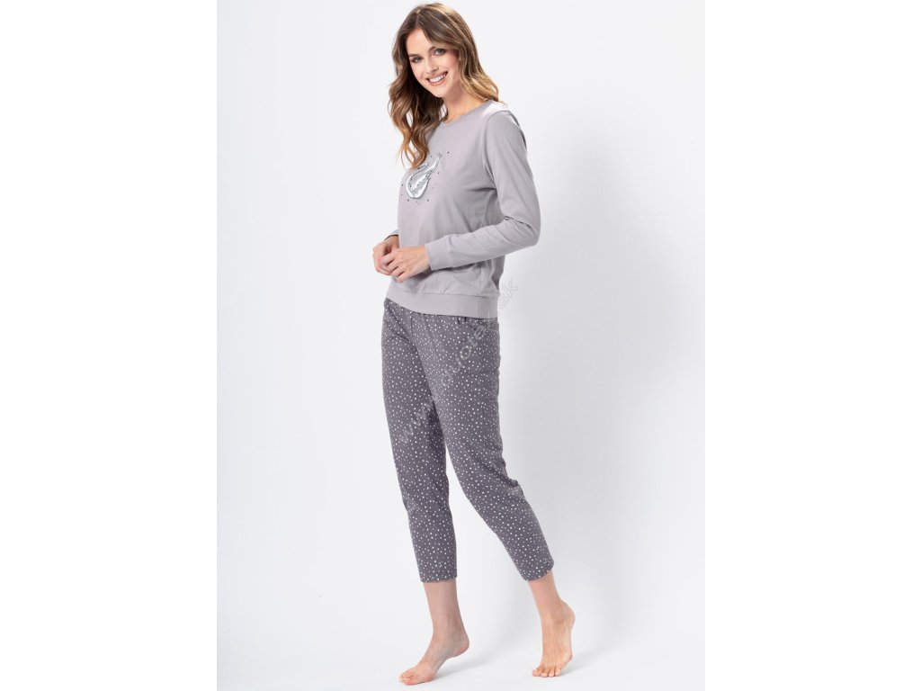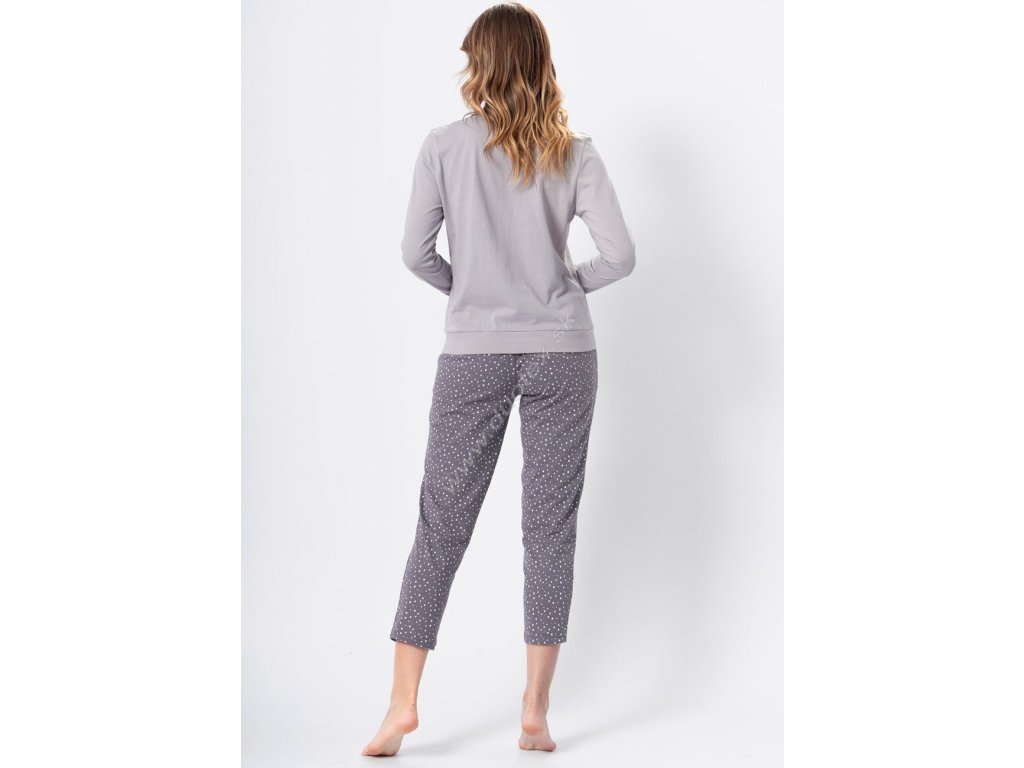 dámské pyžamo s dlouhými rukávy a 7/8 kalhotami s bočními kapsami vyrobené ze 100% bavlny. Pyžamo je vyhotoveno s všívanou gumou v pase kalhot, spodní část trička a rukávů je stažena do pružného lemu.