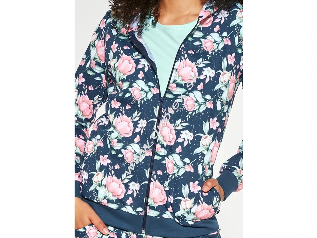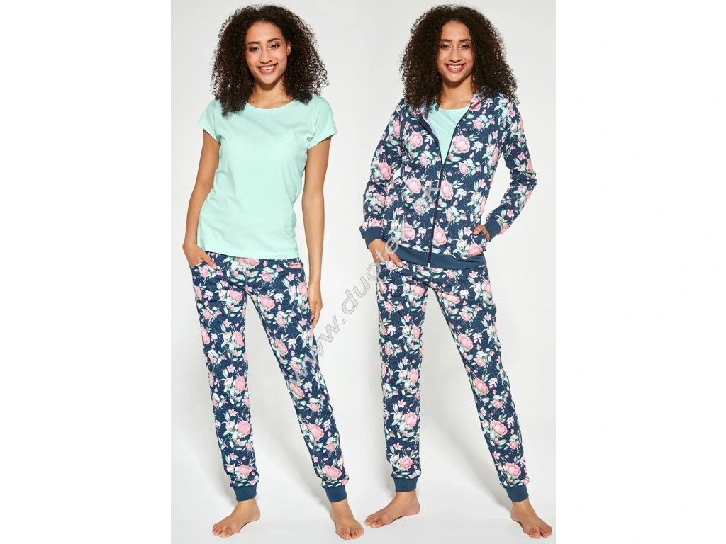 Dámské třídílné pyžamo ze 100% bavlny. Sada obsahuje: tričko s krátkým rukávem, mikinu na zip s kapucí, patentem a kapsami, dlouhé kalhoty s bočními kapsami a širokou gumou v pase lemovanou bavlněným úpletem, ukončeno pružným patentem. Tato třídílná sada je vhodná i jako domácí oblečení.