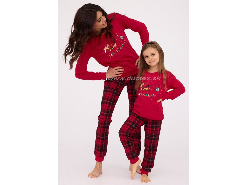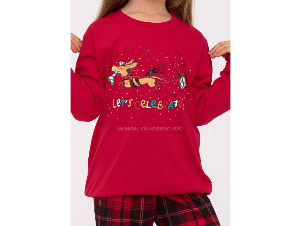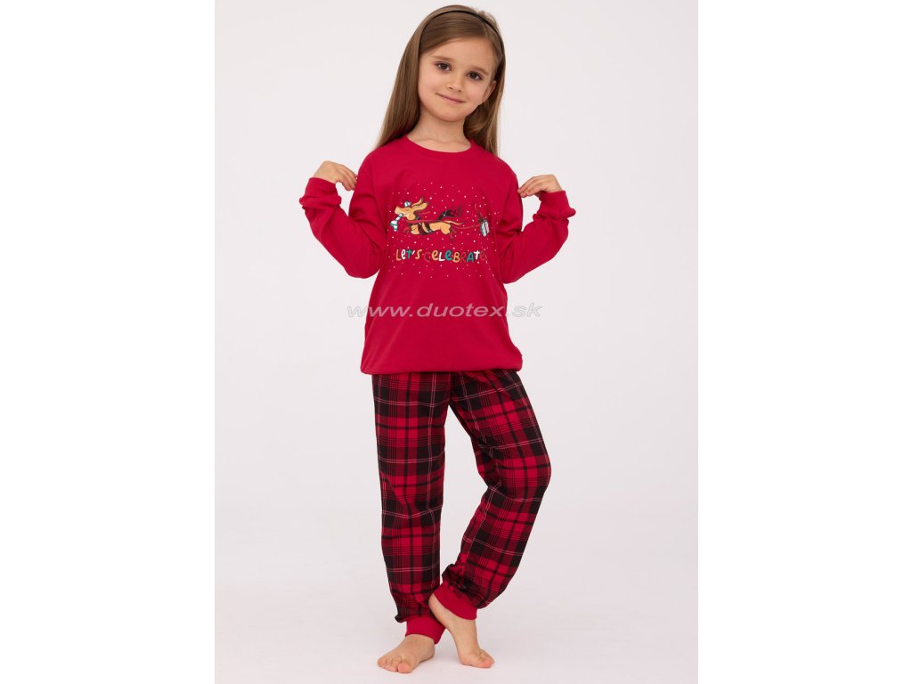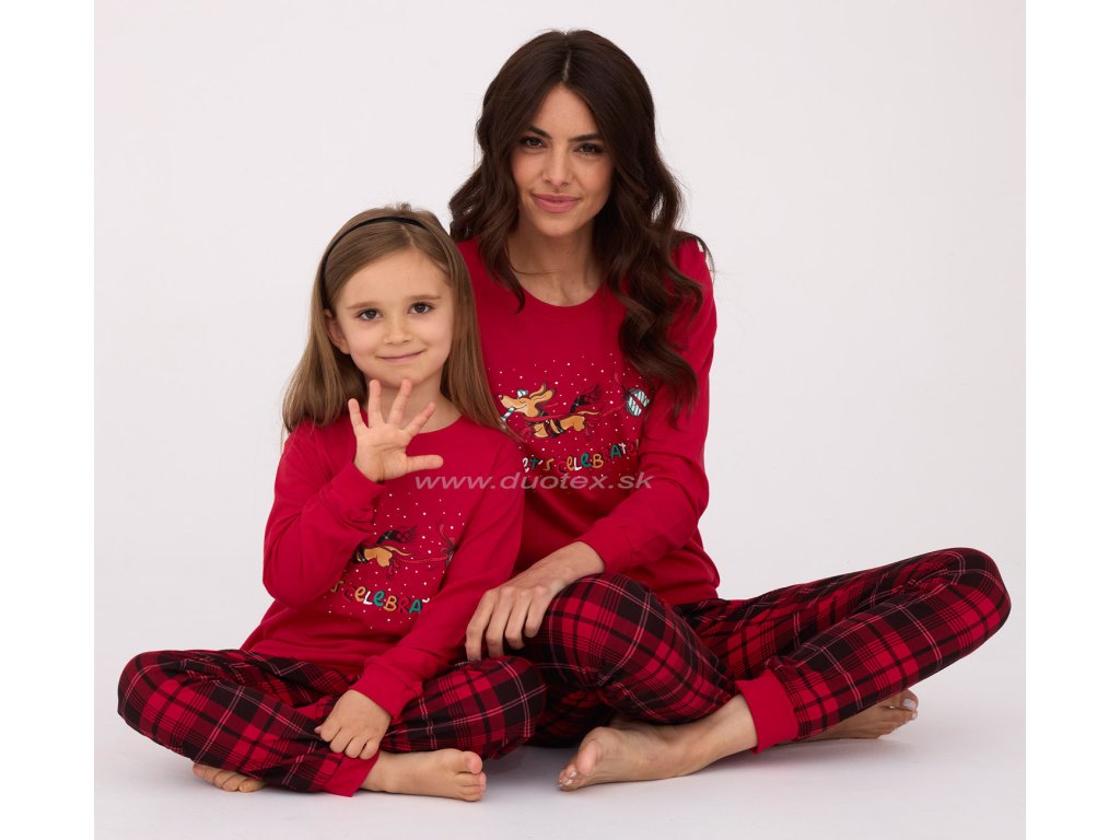 Dievčenské vianočné pyžamo s okrúhlym výstrihom, s dlhým rukávom a dlhými nohavicami, spodná časť rukávov i nohavíc stiahnutá do pružného lemu, všívaná široká guma v páse nohavíc. Pyžamo je vyrobené zo 100% bavlneného úpletu. Pyžamko patrí do vianočnej rodinnej kolekcie spolu s dámskym pyžamom 671/371-Celebrate a pánskym pyžamom 115/255-Celebrate. Vytvorte si vianočnú pohodu s pyžamami Celebrate (mama a dcéra, otec a syn) .