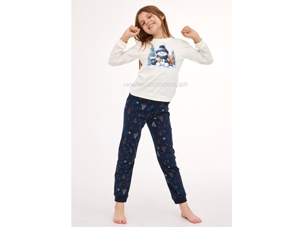 Dívčí pyžamo s kulatým výstřihem, s dlouhým rukávem a dlouhými kalhotami, spodní část rukávů i kalhot je stažena do pružného lemu, všívaná guma v pase kalhot.