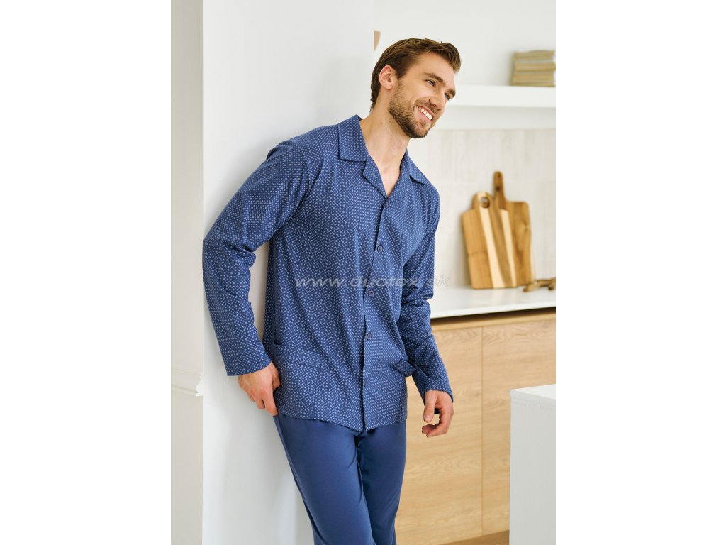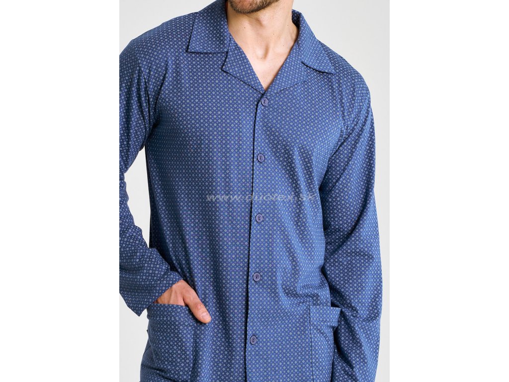 Pánské pyžamo s dlouhým rukávem a dlouhými kalhotami, zapínání na knoflíky podél celého předního dílu, všívaná guma v pase kalhot. Pyžamo je vyrobeno z úpletu ze 100% bavlny.