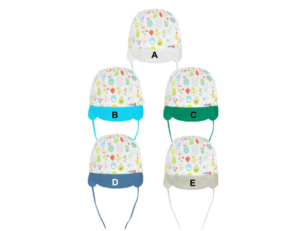 Detská letná čiapka so šiltom vyrobená z tenkej bavlnenej tkaniny, zadná časť je dierkovaná, stiahnutá do gumičky. Čiapka je vyhotovená s ochranou ušiek proti vetru a šnúrkou na viazanie.
