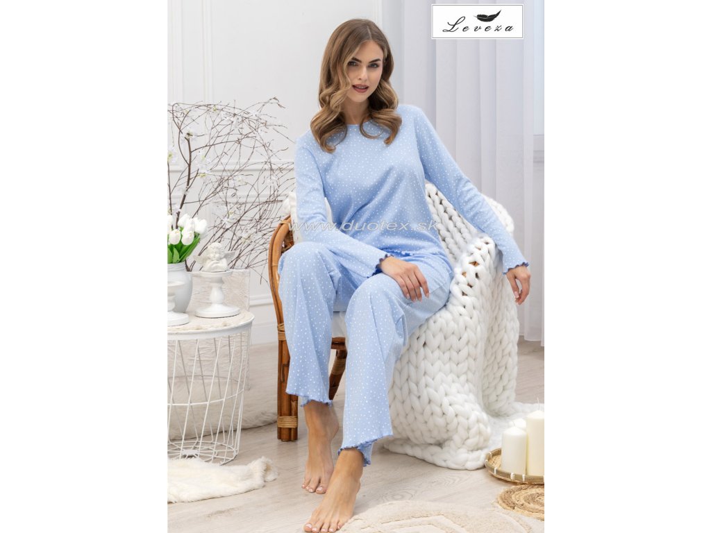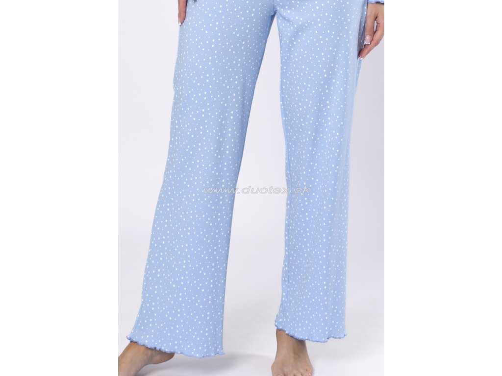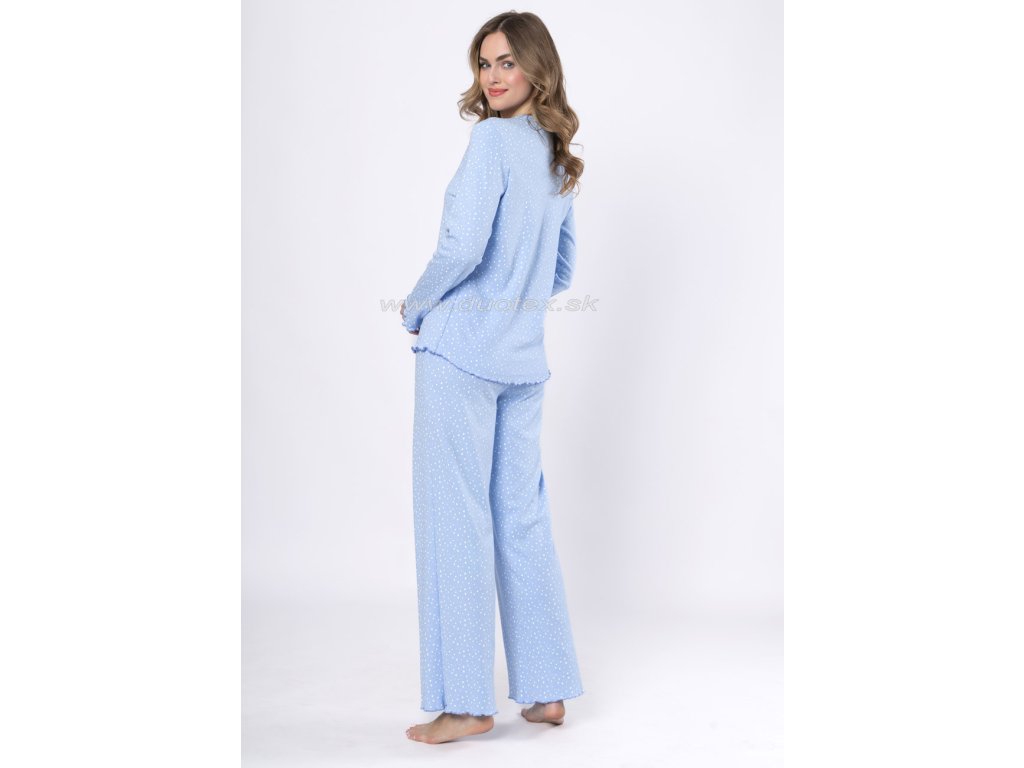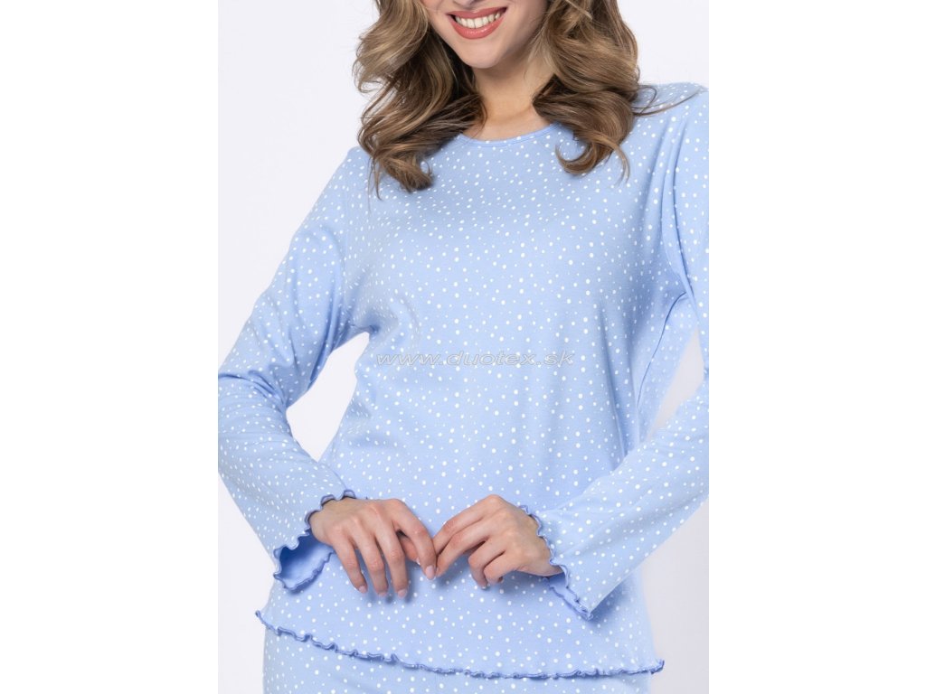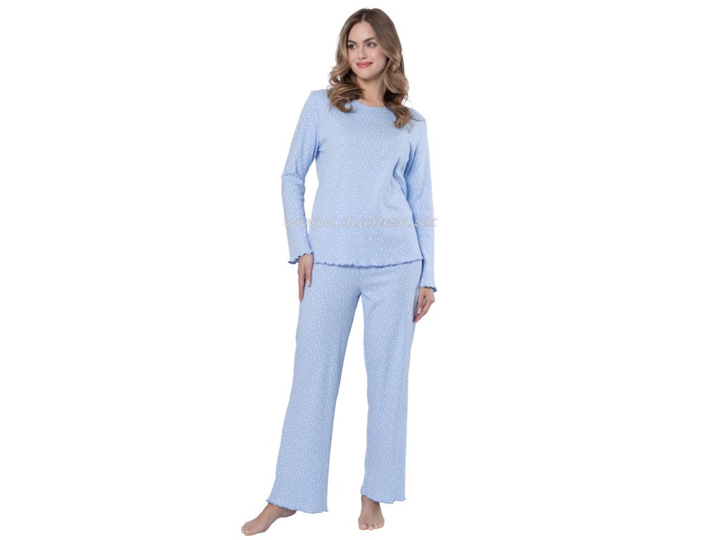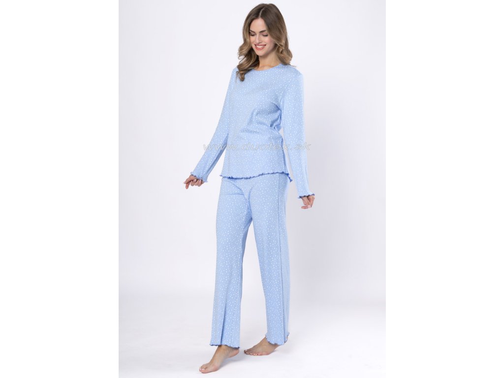 dámske pyžamo s dlhými rukávmi a dlhými nohavicami vyrobené zo 100% bavlny. Vrchná časť pyžama, rukávy aj nohavice sú ukončené ozdobným lemom